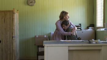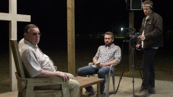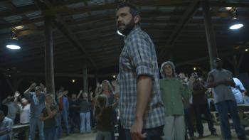 Yet West is such an inventive, powerful filmmaker that he still manages to establish some interesting spaces, even with the clunky hand-held camerawork. The blocky cabins, the space between, a pavilion, and darkness, all come into play. Moreover, he gets a great performance from Jones as the avuncular yet slippery Father, giving an interview with sunglasses on and addressing many of his answers to his followers, rather than to his questioner. It's a moment that's so seductive it's genuinely spooky.